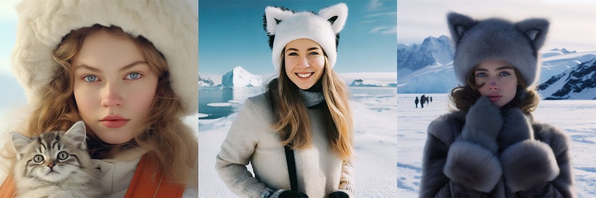 film still, A very pretty young Russian woman wearing a hat with bushy cat ears stands on the snow in Antarctica