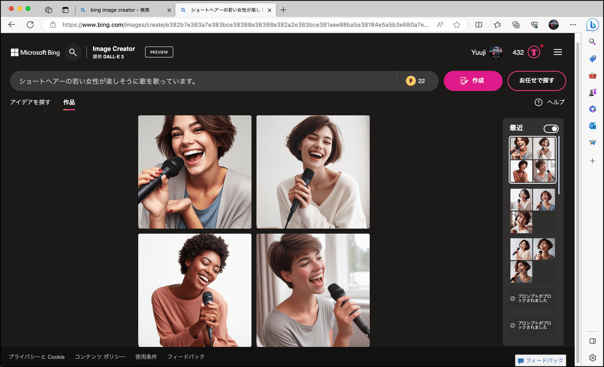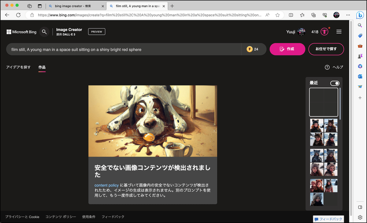 3回試してみましたが全てブロックされます。どのような画像が生成されているのか気になります。