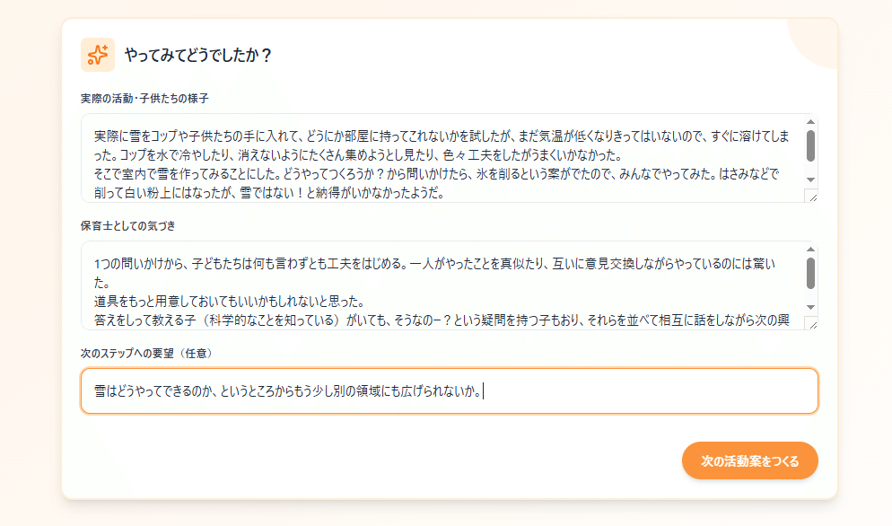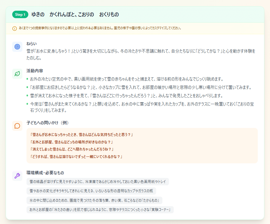 裏は生成AIでプロンプトを組んでおり、ベテランの保育士や探究活動の専門家という人格を与えて、提案を作っている。