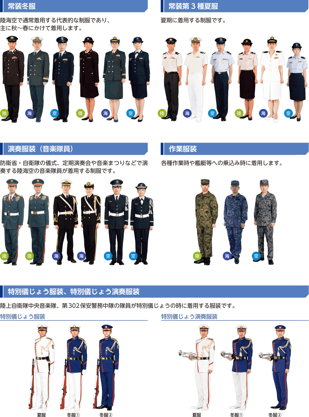 自衛官には主に「常装(常服)」「第1種礼装」「第2種礼装」「通常礼装」「作業服装」がある。何を着るべきかは「自衛官服装規則」に記されていて、「皇居に出入する場合」「外国の機関又は文武官を公式に訪問する場合」などの場合は礼服を着用するよう義務付けられている。