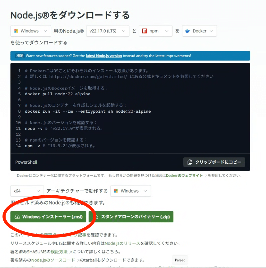 Gemini-CLIはTypeScriptで書かれているため、それを動かすためにnode.jsをダウンロードします。