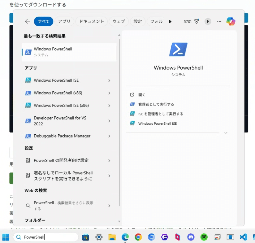 その後、インストールが完了しているのかを確認するため、PowerShellを開いて以下のコマンドを入力します。(PowerShellは検索したら出てきます。)