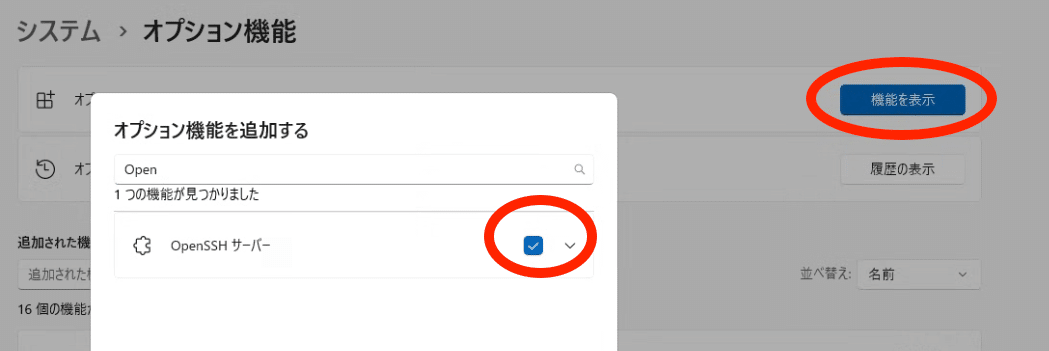 そこの”システム”→”オプション機能”の中から”オプション機能を追加する”の”機能を表示”にてOpenSSH サーバーを検索して選択します。