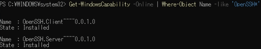 Get-WindowsCapability -Online | Where-Object Name -like 'OpenSSH*'OpenSSH.ServerのStateがInstalledと表示されていれば大丈夫です。