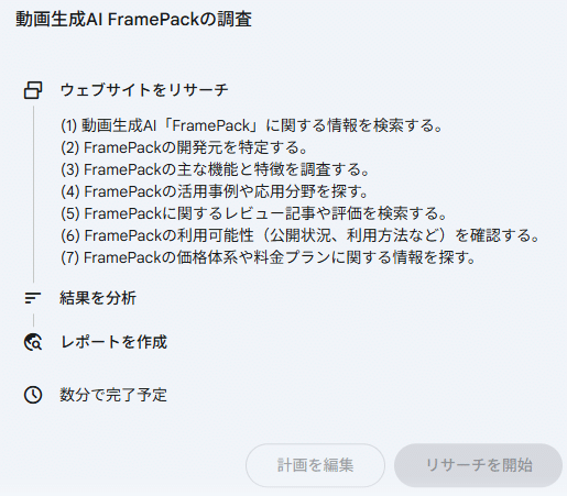次点がGoogleのDeep Researchで、Google検索を利用したWeb検索の幅が広く、分析よりも検索を重視して沢山の対象を調査したいときなどに役立ちます。