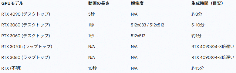 低VRAM要件: 6GBのVRAMで動作可能で、RTX 3070TiやRTX 3060のようなノートPC向けGPUでも利用可能。ただし、RTX 4090では1フレームあたり1.5~2.5秒で生成可能で、30秒の動画生成に約30分かかると報告されています。