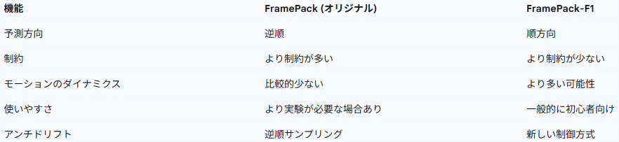 以上のように、FramePackは処理速度、コストパフォーマンス、スケーラビリティ、そして独自のアルゴリズム設計において競合製品と比較して明確な優位性を持っています。ただし、カメラの動きが不安定な場合や静止したシーンがない場合に出力動画に不一致が生じることがある点や、人物描写の質感に関する改善余地は依然として残されています[[10]]。今後のさらなる開発によって、これらの課題がどのように解決されるかが注目されます。