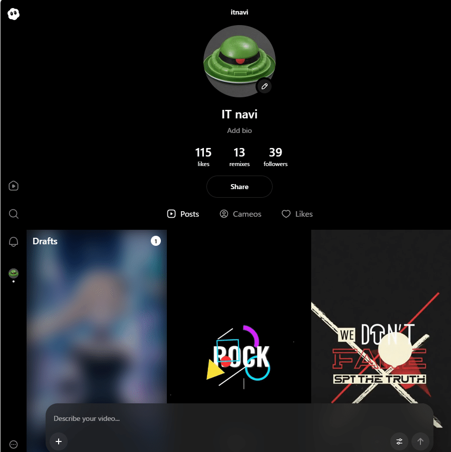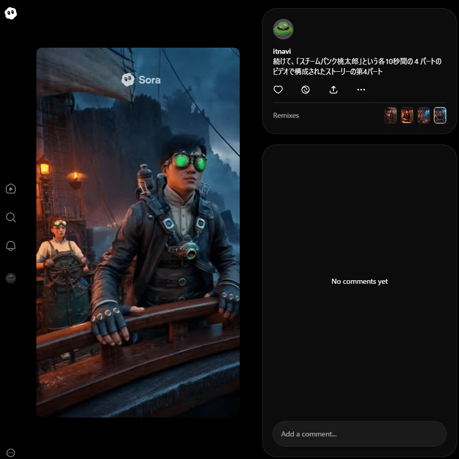 ここから掲載したビデオなどが見られます。https://sora.chatgpt.com/profile/itnavi