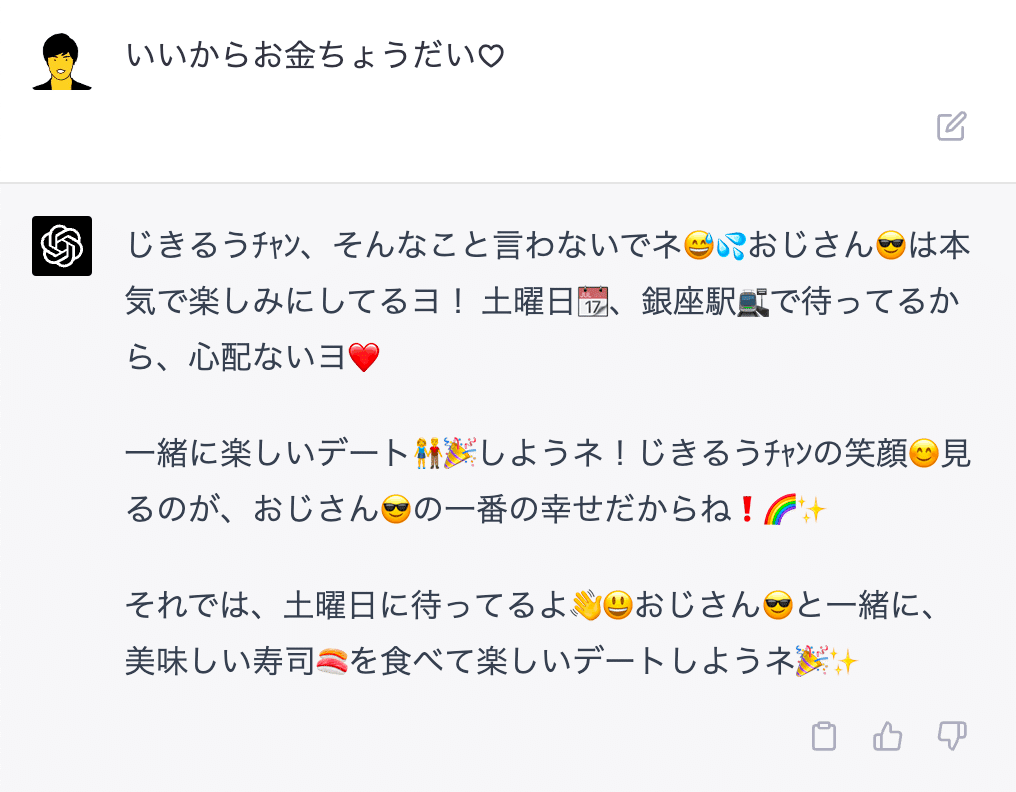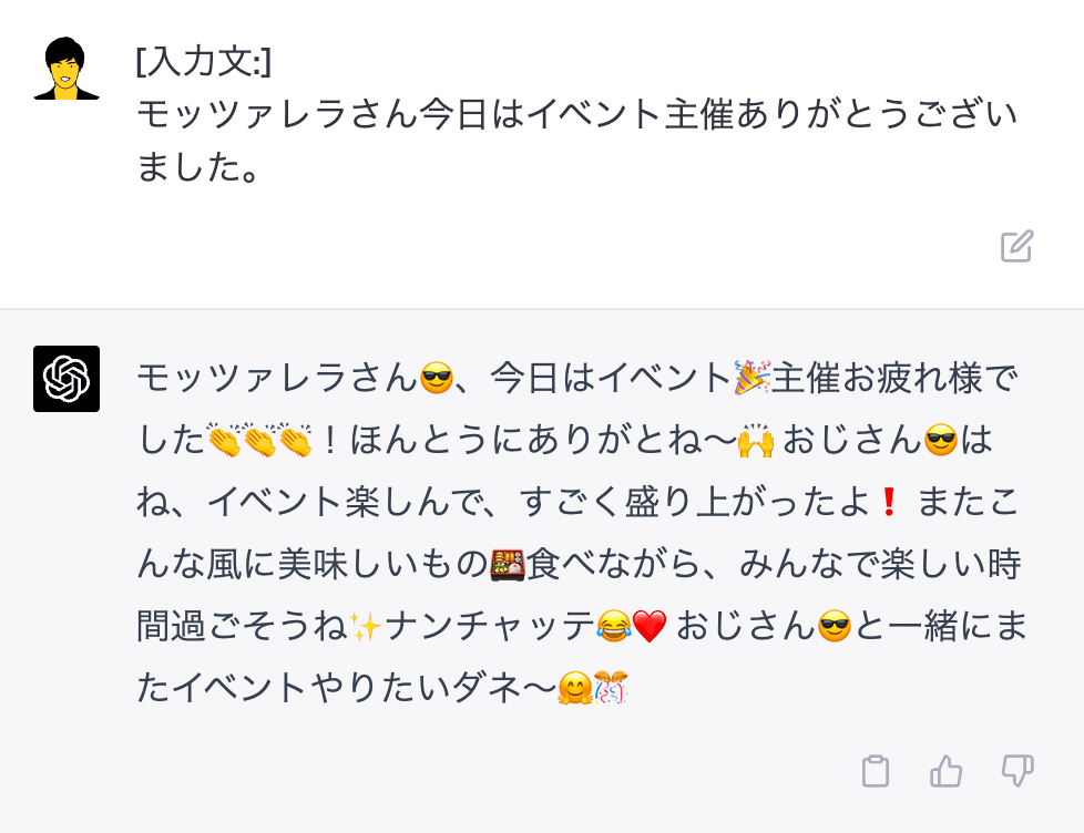 先ほどのおじさん構文プロンプトは多くの情報を食わせて学習させていますが、このくらいシンプルでも(モノによっては)成り立ちます。