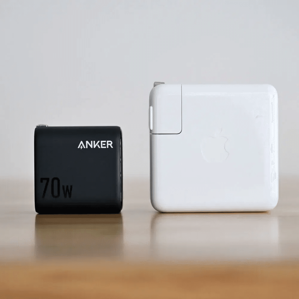 Apple純正の70Wアダプタと比較して約60%も小さく、持ち運びの負担を劇的に減らせます。