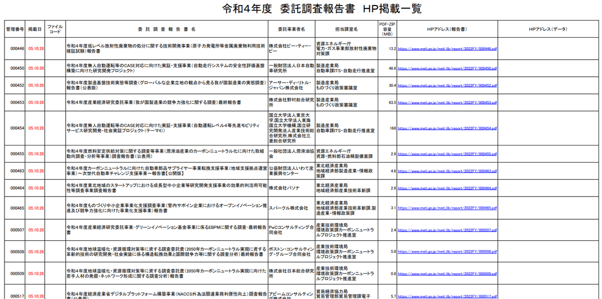 こんな感じのリストがずらっと並べます。エクセルでも同じようなものがダウンロードできます。正直見づらいですが、このリンクの一つ一つが調査報告書になっています。