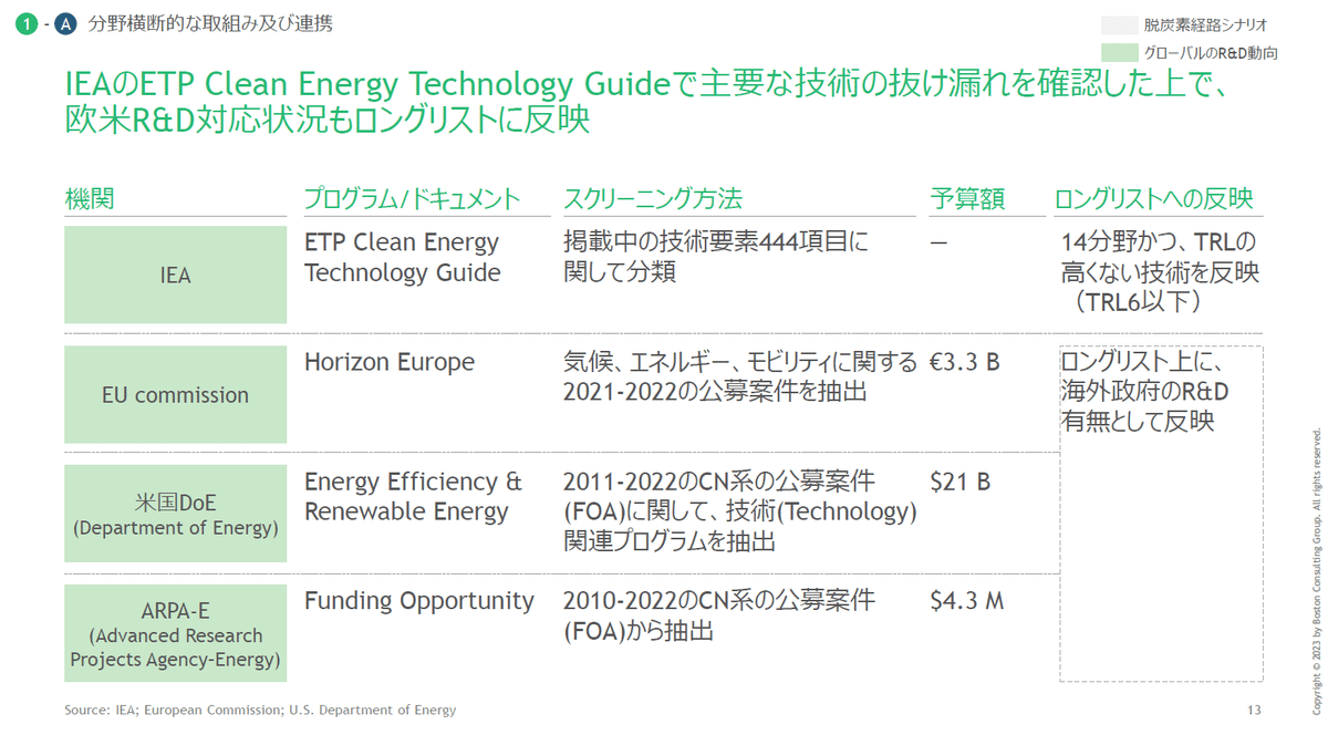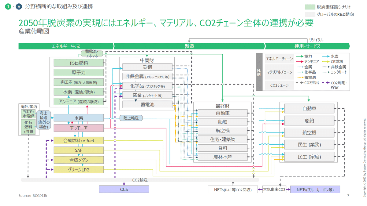 おそらくBCGグローバルで作った資料を日本語に翻訳しています。理由は2つで、ここまで込み入った資料をゼロベースで作ることは(コスト的に)まずなさそうということと、左上の「蓄電池・エネマネ」というボックスから文字がはみ出していること。スペースに余裕もありますしね。おそらく、元々英語か何かで作ってあった資料を日本語化した結果とも思われます。
