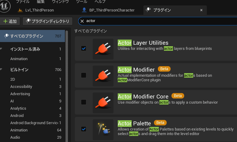 Actor Paletteが出てくるので✅を入れます。プロジェクトを再起動