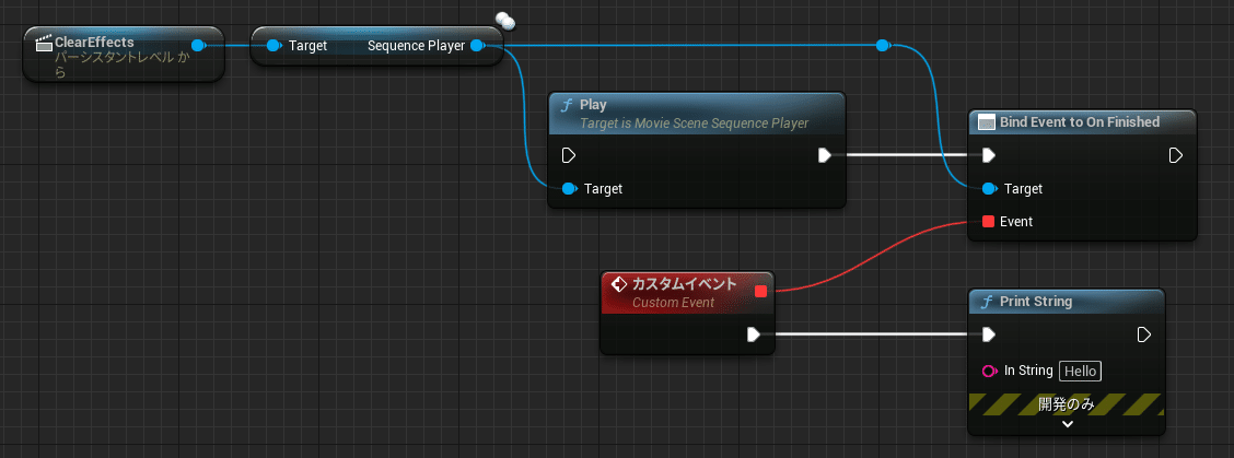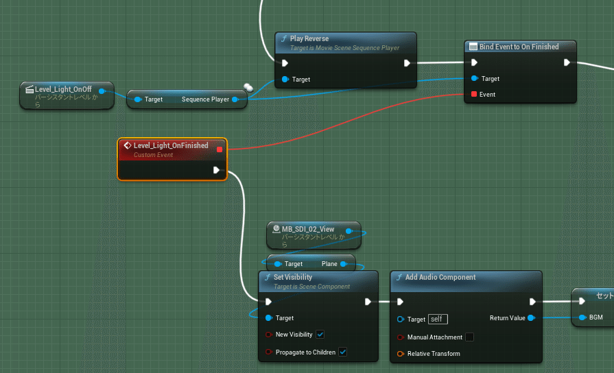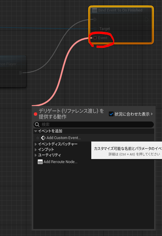 そうしてできた、Bind Event to On FinishedノードのEvent(赤い四角)から線を引っ張ってきてイベントを作成します。