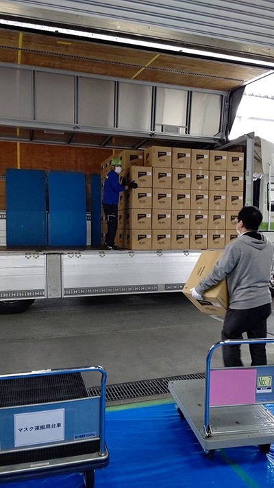 マスクの段ボールを1個1個手で運んで、トラックの荷台いっぱいに詰め込んだ。