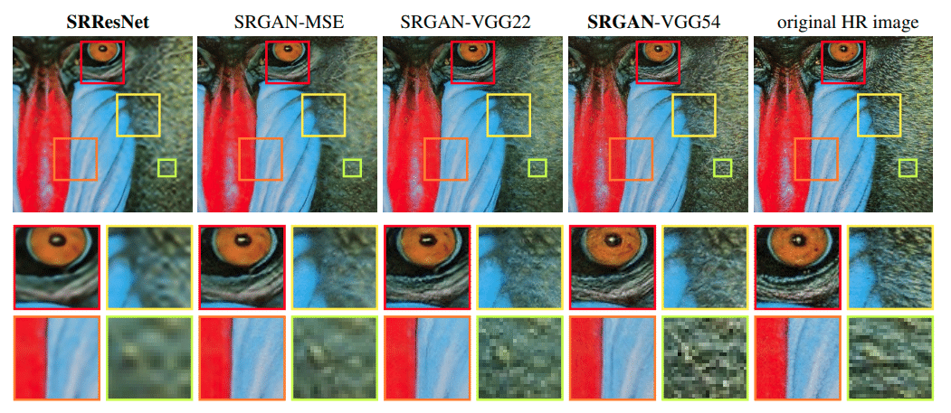 SRGAN では、高周波成分をうまく表現することができ、ぼやけが非常に少なく、元画像のような緻密な表現がある程度できていることがわかります。 SRResNet では、定量評価で SRGAN を上回ったものの、画像がぼやけていることがわかります。