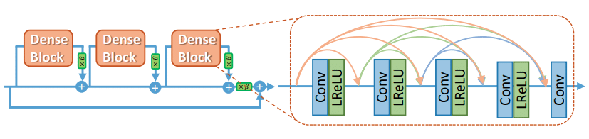 ESRGAN では GAN の Generator 部分のネットワークに改良を加えて、下のような 「Residual-in-Residual Dense Block(RRDB)」というより深いネットワークを採用しています。RRDBは残差ブロックの中に残差接続の構造を持っており、異なるレベルでの残差学習をすることができます。(多分 U-net みたいな構造に近くなるんだと思う。)