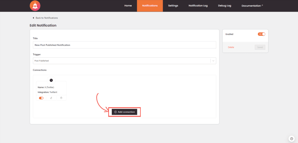 - Save the Integration: After configuring the Facebook settings, click Save to save the integration. This will close the connection modal and apply the settings to your notification.