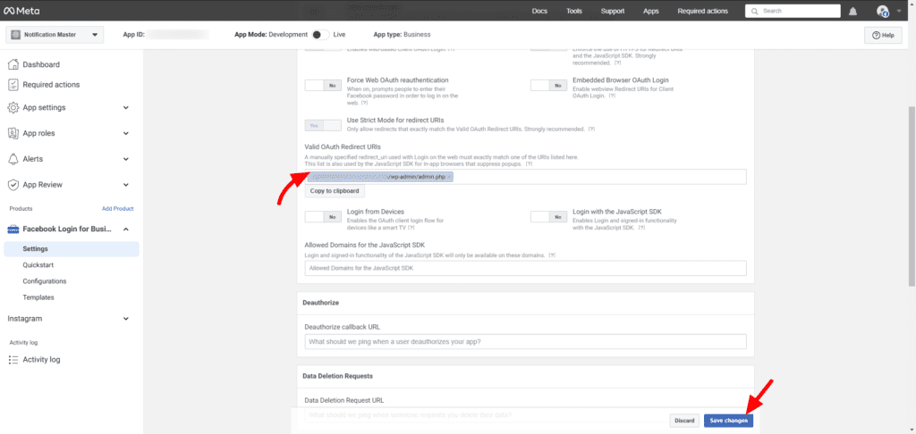 - Copy your redirect URL from your connection page and past it into the Valid OAuth Redirect URIs then click Save Changes.