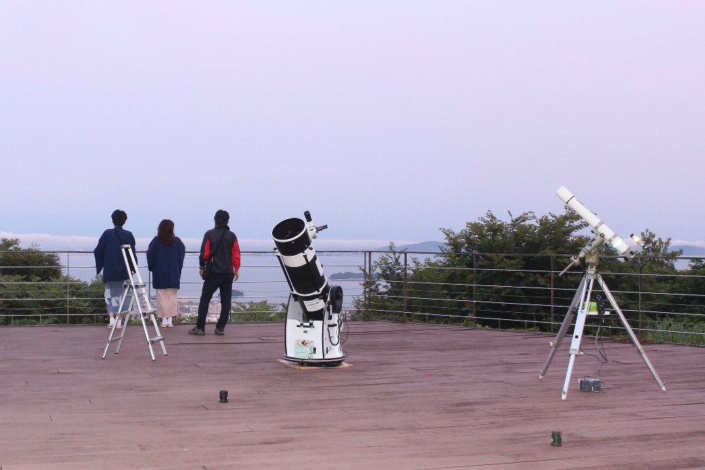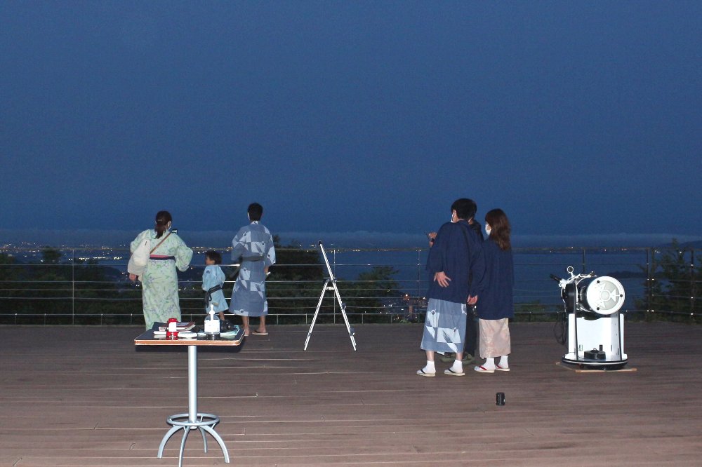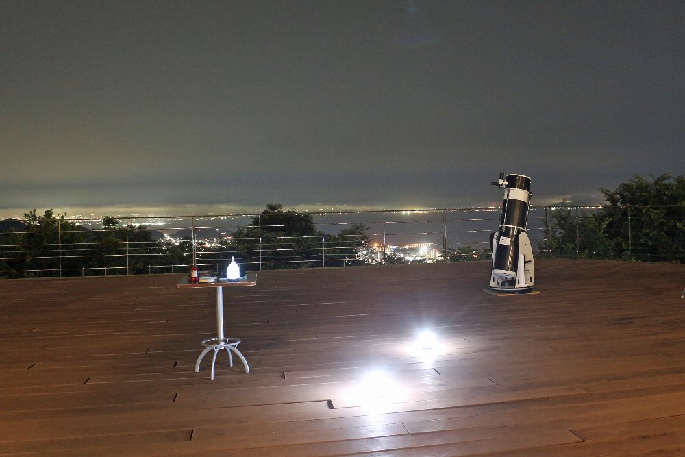 下界は蒸し暑く26度、「天の丸」のテラスは、涼しい21度で半袖では寒さを感じるほどです。これから迎える暑い夏、涼しい天の丸に是非お泊りいただき天体望遠鏡をのぞきに来てください。