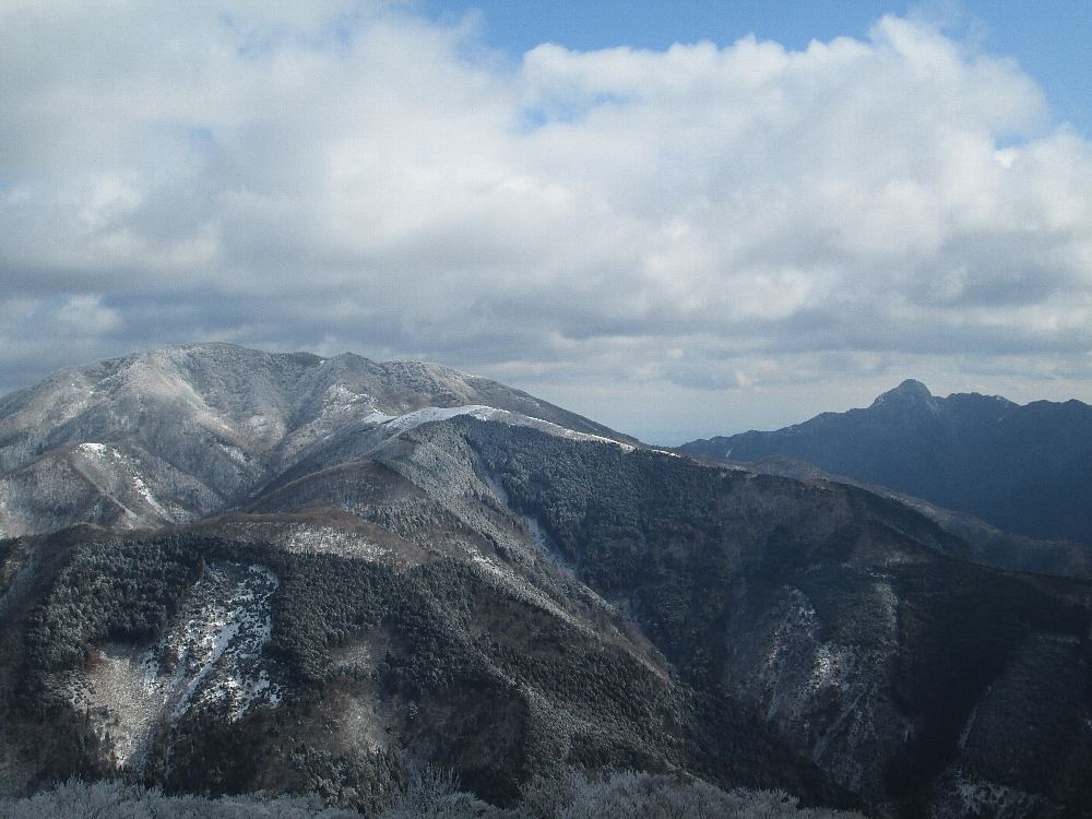 山頂に着いた直後は少しガスっていたせいか、下方に水面が広く光っていて、これを「琵琶湖だ?」「いや伊勢湾だ!」と方向がわからなく周辺には恥ずかしい言葉が飛び交っていました。しかし、時間と共に、目の前が雨乞岳、その右側の尖ったのが鎌ヶ岳、先ほどのは、伊勢湾と周辺がわかってきます。北側の樹林越しに白く目立っている伊吹山もはっきり見えます。なかなかの眺望で、雲間から見えた「綿向ブルー」に白銀の木々が映え、それには魅了されました。予想していた体感マイナス10度というほどでなく、微風だったので極寒を感じることもなくここで昼食がとれました。温かいカップ麺+コーヒーは最高です。山頂の気温はマイナス6度と、プラス2~3度と計測機器で別れましたが、ペットボトルの飲料水が一部凍っていたようなので仲をとって、氷点下2度という結論に達しました。他の登山者の方も、おにぎりが凍っていたと話されていたので、カイトウして食べて下さいとカイトウすると、笑ってはいただけましたが、もっと寒くなったかもしれません。
