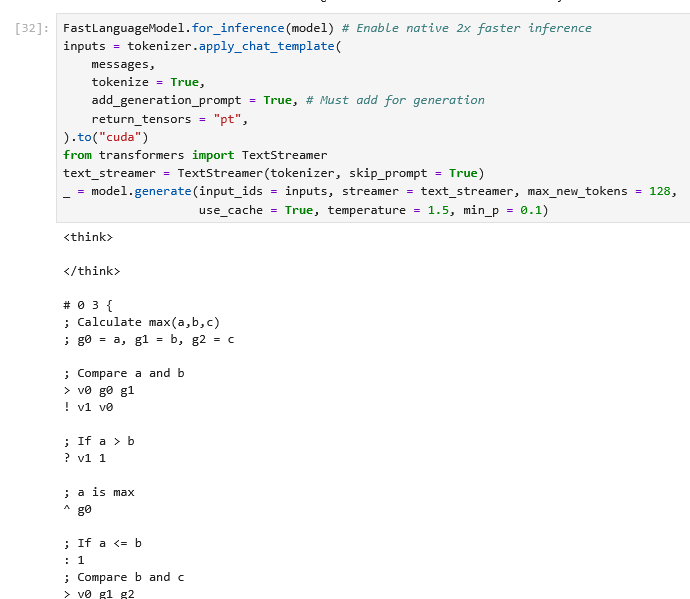 ほんとは言語リファレンスなしでもちゃんと書けるようになると面白いのだけど、そうすると継続事前学習が必要で手間が増えるのとウチの16GB VRAMではメモリが足りなかった(21GB使ってた)ので、今回はあきらめてシステムプロンプトに言語リファレンス入れてます。