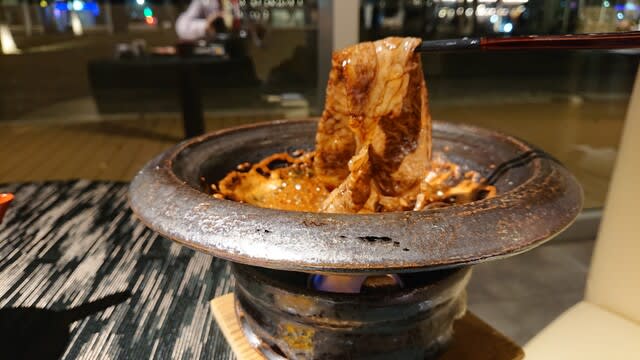 そして黒い鍋が運ばれ、固形燃料で鍋が温められ、その中に醤油出汁のすき焼きスープが入れられました♪