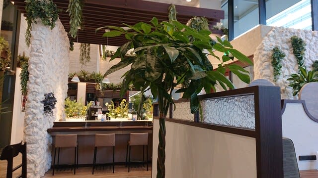 お店はかなり新しく天井も高く、天井にはシーリングファンが回っていて、そして壁側は総ガラス張りで明るく、そして店内は観葉植物もふんだんにあり広いです♪