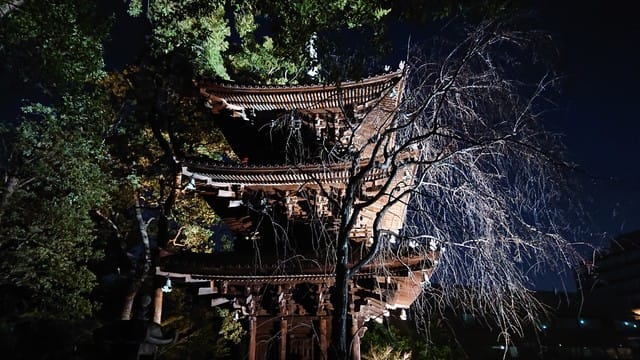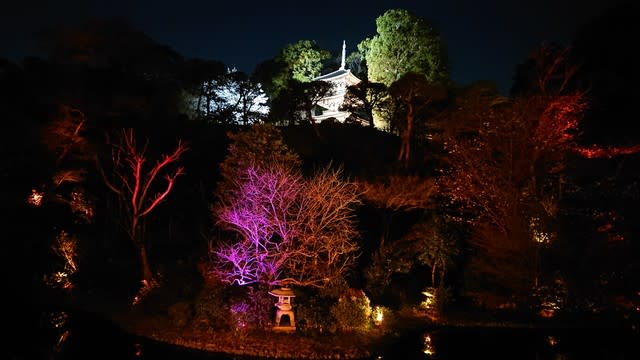 ↑赤いライトアップと三重塔
