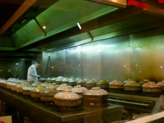 通りから見えるガラス張りのコーナーにずら~っと土鍋が並んで、鶏がぐつぐつ煮込まれてるのをこれ見よがしに見せています。