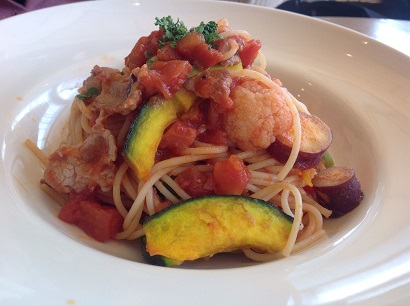 YURIさんのメインは、塩麹豚のパスタだよ。これもずいぶんおいしそうだね。