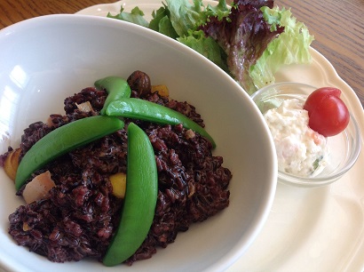 わたしは、珍しさと、前回食べたけどおいしかったよというYURIさんの一言も大いに参考にして、黒米の鮭リゾットだ。「微辣」とあるように、見た目以上にピリッとする辛さがある。黒米ってデザートとして見ることが多かったので、辛いとなんか意外な感じがした。