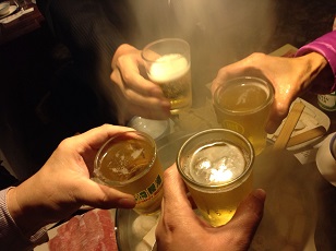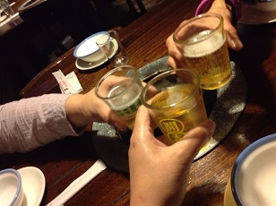 注文が終わったところで、まぁ、ひとまず頼んどきますかと、まず第一次カンパイ~~