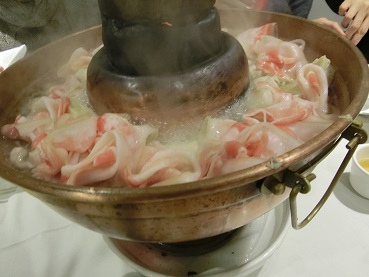 で、これは名物の「酸菜白肉鍋」ですよ~、中に炭が入ってますよ~、寒い季節、寒い地方ではたまらなくあったまりそうな鍋です。