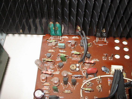 え~、オフセットの調整でござりまするが、メイン部初段の抵抗を変更すれば調整ができるかと思いまする。で、調整したのが5本足のトランジスタに繋がる抵抗でござりまする。元は5.6KΩの抵抗でござりまするので、調整がしやすいように10KΩの可変抵抗を使いましたでござりまする。こちら、左側。(・・・レフトチャンネルって言えよ。)んで、右側っす。平行してアイドリングの調整も行いまする。後は、リレーかな?接点の足が斜めに...