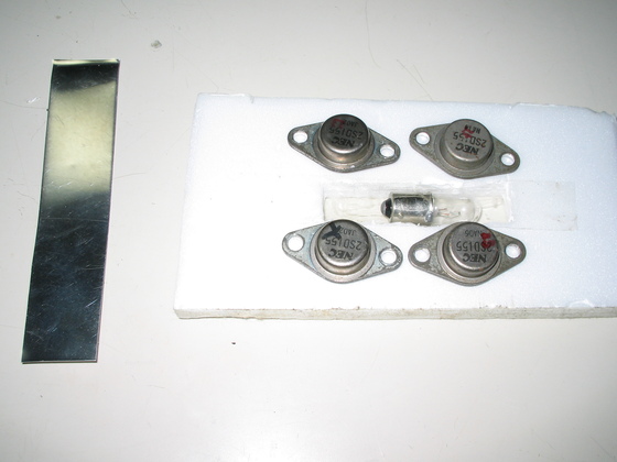 ファイナル待ちで、作業が中断しとりました、KA-2600の続きでございます。届けられたのはファイナル4個+パイロットランプ2個。(写真は交換後の残りっす。)速攻でhFEを揃えて、交換しましたぁ。で、エミッタ抵抗も依頼者の希望で、4個とも交換~!逝っちまってた元の抵抗は?58.96MΩ!メガですゼ?メガ・・・。1枚目の写真、左に写っているのは、アルミ板っす。それを解りますぅ?右から3番目・・・。アルミ板を丸めてランプに被...