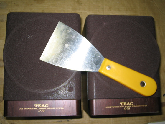 暫く前に入手しておりました、TEACの12cmフルレンジを搭載した、S-70でございます。狭い場所でも音声出力の確認ができるかと・・・。 ぢつは、アムプ修理UP後の確認用に使っとりました、 VictorのUXT-100Dを落として壊したための代替を狙っとります。先達の情報を確認しますと、ネットは接着剤で留められているらしいっすが、簡単に外れるそうなので、100均のスクレーパーを用意したっす。背面~極普通のターミナルとバスレフポ...