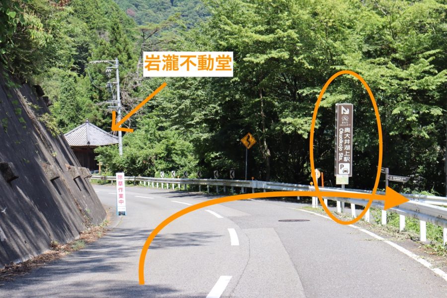 目印の『岩瀧不動堂』を通り過ぎて50mほどのところに、『奥大井湖上駅駐車場の看板』が見えてくるので、そこを左に入ります。