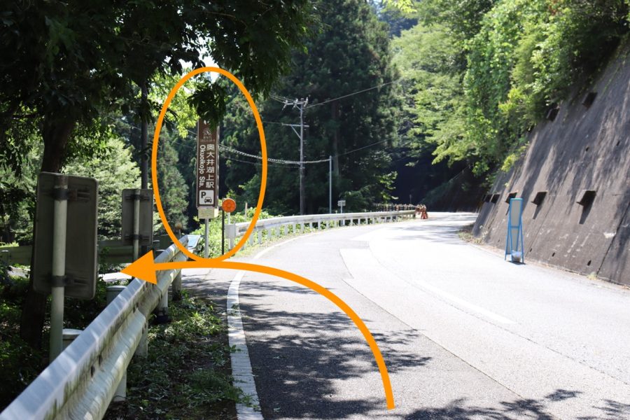 右手に『奥大井湖上駅駐車場の看板』が見えてきますので、ここを鋭角に右に曲がって細い道を下ります。これが駐車場へつながる道です。