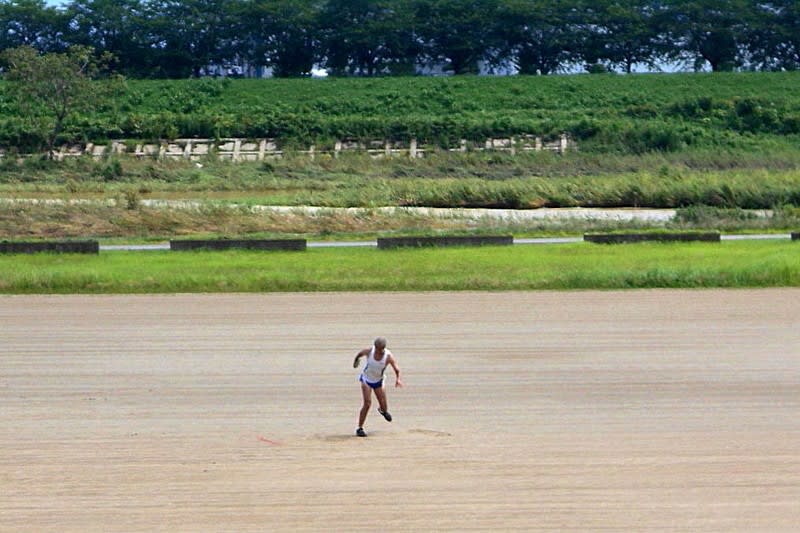 炎天下、わずかな木陰に助けられながら走る。