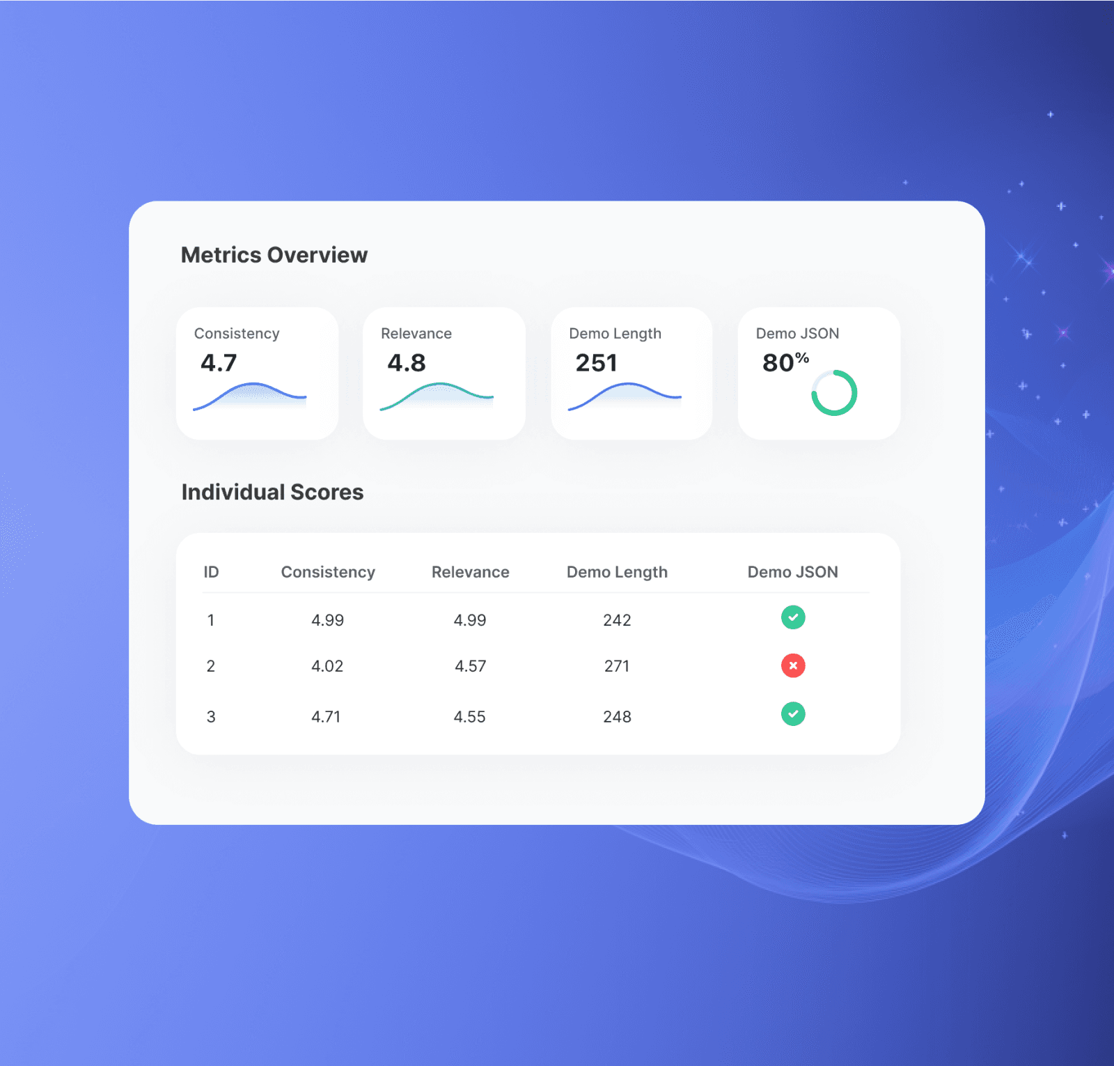 Okareo evaluates LLMs by applying checks. It includes some built-in checks, such as how coherent the output is. It also allows you to define your own custom checks in natural language, which it will then use to prompt another LLM acting as a judge to perform the evaluations.