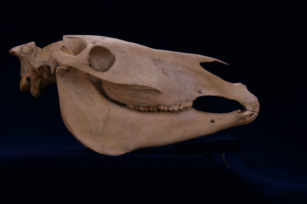 このウマの頭骨は、約60年前に実施された地下鉄4号線(現・Osaka Metro長堀鶴見緑地線)の森ノ宮駅の工事中に地下約5mの地層から発見されました。この周辺の地下約10mの地層からは、ウマの肢や腰の骨も見つかっています。正確な地質年代は分かっていませんが、それらの地層が堆積した当時の日本には、既にウマが生息していたことを教えてくれます。漢字はもちろん「馬」です。