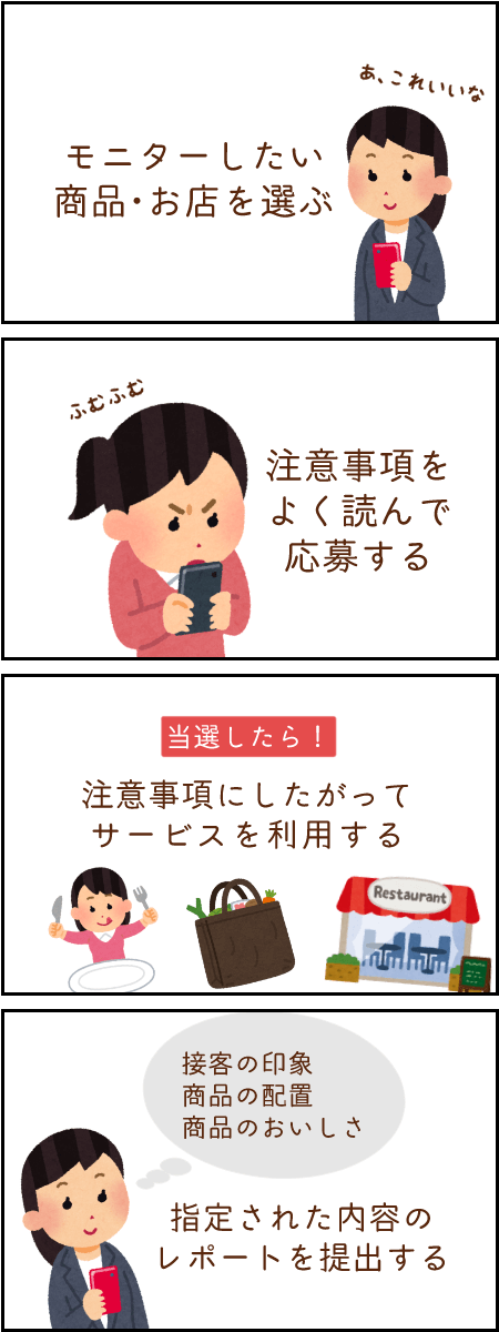 - モニターしたい商品・お店を自由に選べる
