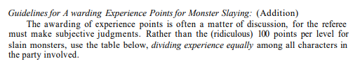 So the new rule was instituted that The Formula suggested even in OD&D would be used: monster HD x 100 divided by player level or whatever it is. We all rapidly saw Our Gains go down the drain.