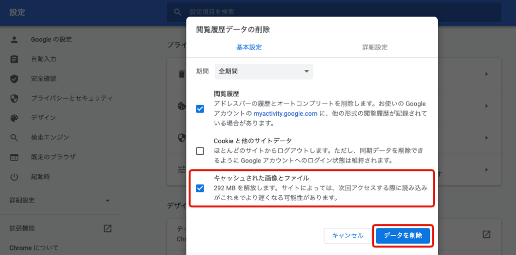 - 「キャッシュされた画像とファイル」にチェックを入れて[データを削除]をクリック