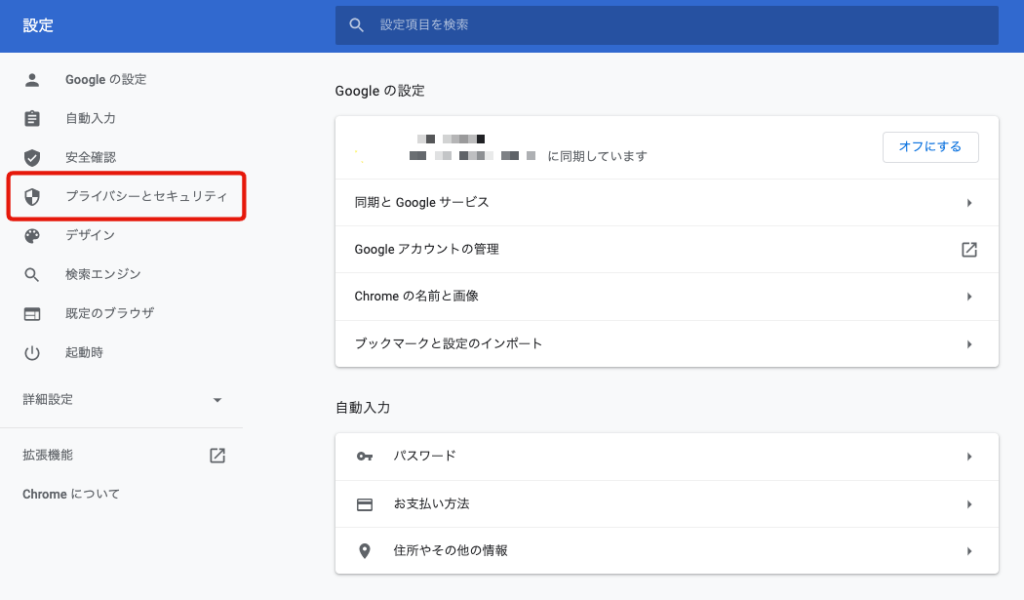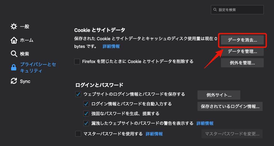 - 「cookieとサイトデータ」の「データを消去...」をクリック