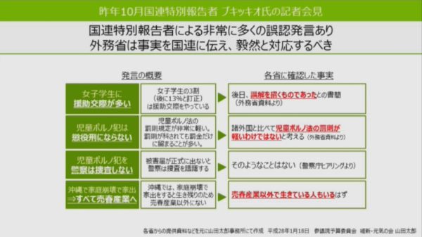 その流れを受けながら、2015年10月19日にマオド・ド・ブーア=ブキッキオさんが来日します。この方は国連の児童買春等特別報告者、いわゆる人権理事会の報告官です。その方が、「私(山田)のところにも会いたい」ということで、来日された次の日に、参議院議員時代の私の議員室で面会をすることになりました。この国連の報告者というのが、実は相当力を持っているんですよ。国連の人権委員会の各報告書をまとめる人でもありますから、最終的に国連の正式な勧告をまとめる役割も担うわけです。この人たちが誤解をしたまま、あるいは一つの固執した考え方を持ったまま帰国されてしまうとエラい目に遭う……。そんなことを思いつつ、ブキッキオさんと会うことになったわけです。