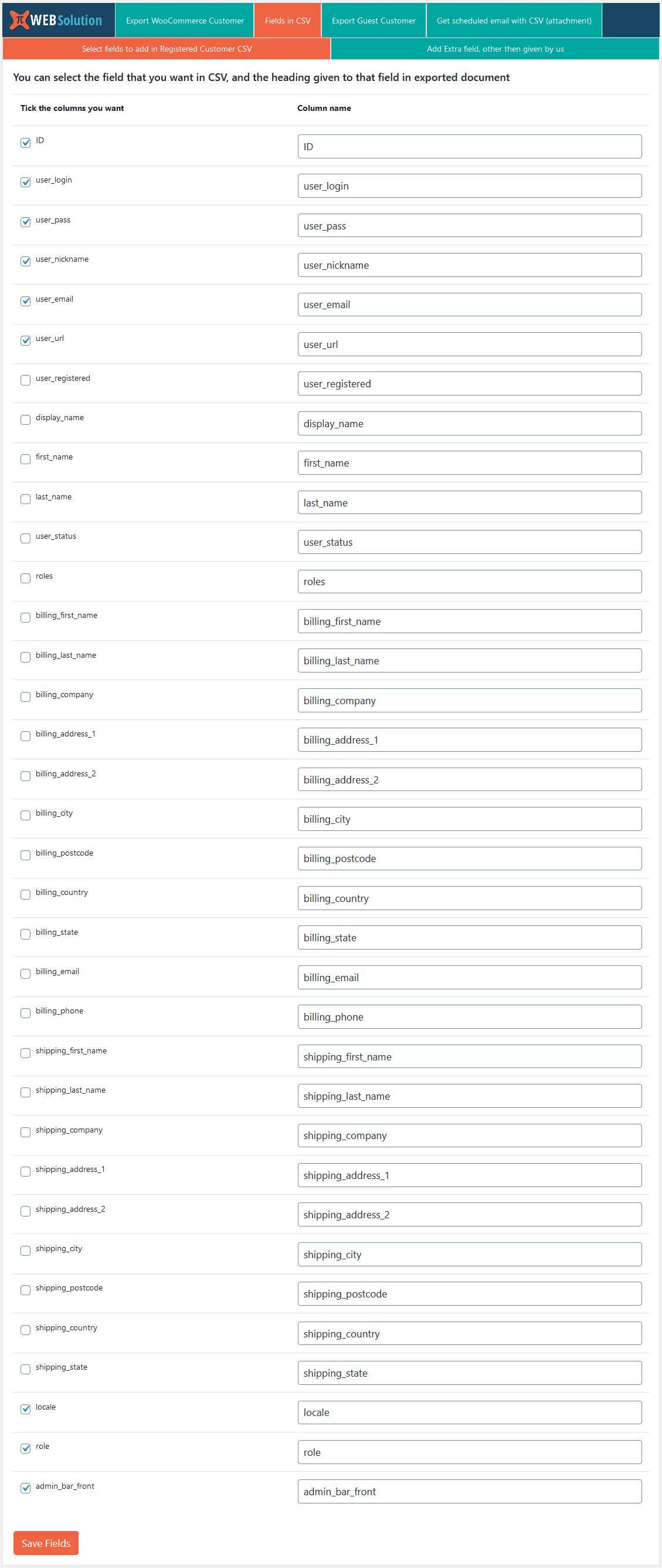 I want all the WooCommerce customer fields in the exported CSV