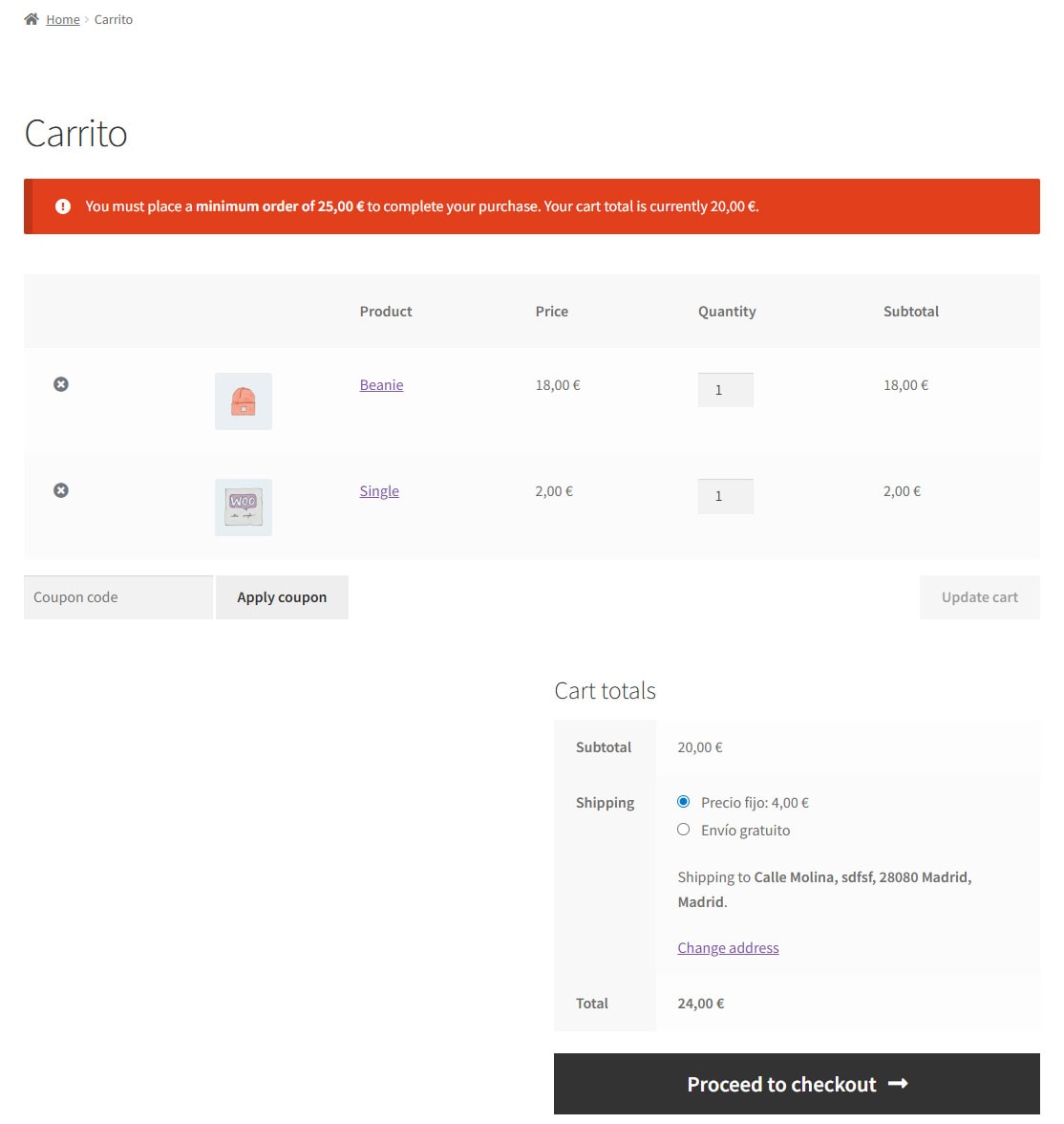 Contributors“Minimum order for WooCommerce” has been translated into 1 locale. Thank you to the translators for their contributions.