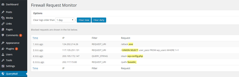 QueryWall analyzes all incoming HTTP requests and silently blocks malicious queries containing risky strings like wp-config.php, eval code, base64_ encrypted code, and many more.